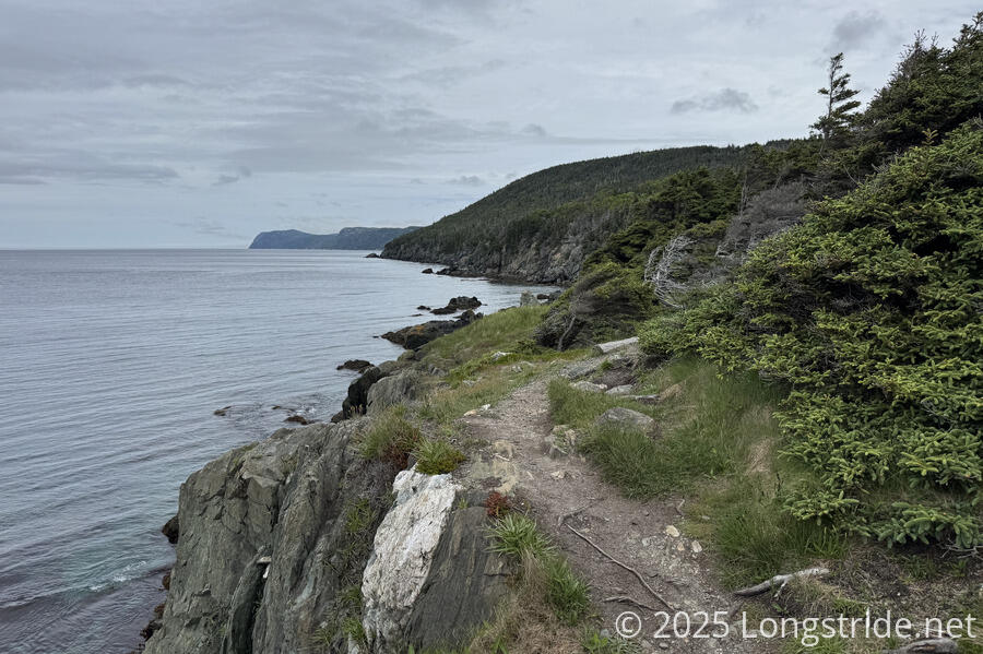 From the terminus at Topsail Beach, we joined the Long Shore Path, heading north along the western coast of Newfoundland’s Avalon Peninsula. The trail followed a generally rugged path with quite a lot of rocks and roots. That said, the trail was well maintained. For a little bit at the start, the trail had a nice gravel bed, which eventually transitioned to a nice pine needle bed, when rocks and roots were not in the way.