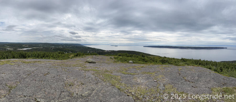 This far north, most of the forest is pine, and not especially tall, especially hindered by the strong winds that blow in off the ocean. Our high point of the day, Beachy Cove Hill (200 m), was a mostly bald slab of rock, with great views of the ocean and the nearby communities. (This was also the longest sustained climb today.)