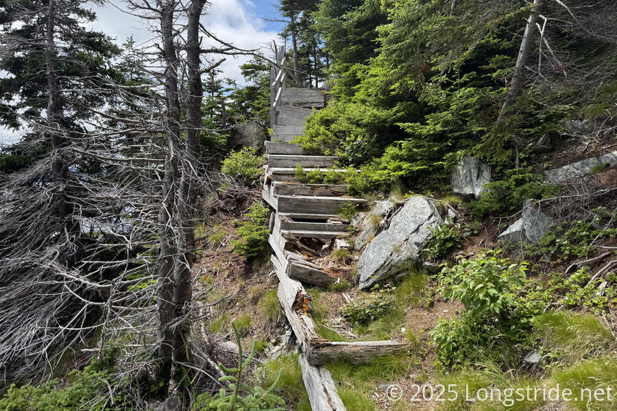 One of the disappointing parts of the East Coast Trail is the (lack of) maintenance. The trail has clearly had an immense amount of work put into it to build the trail, including an incredible amount of boardwalk in areas prone to water. But it seems like it hasn’t been maintained in so long that many boards are rotted, broken, missing entirely, or worse, loose (with the worst offenders swinging up as if you stepped on the head of a rake). The culmination of that is staircases like the one pictured below, where nearly every rung is splintered, tilted, missing its surface or ballast, and several rungs are swamped with overgrown trees.