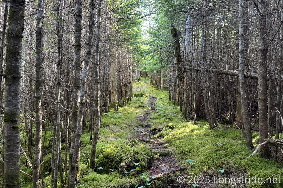 After a kilometer or two, though, the nice trail disappeared, and we had to cross some (mostly dry) stretches of boggy trail.