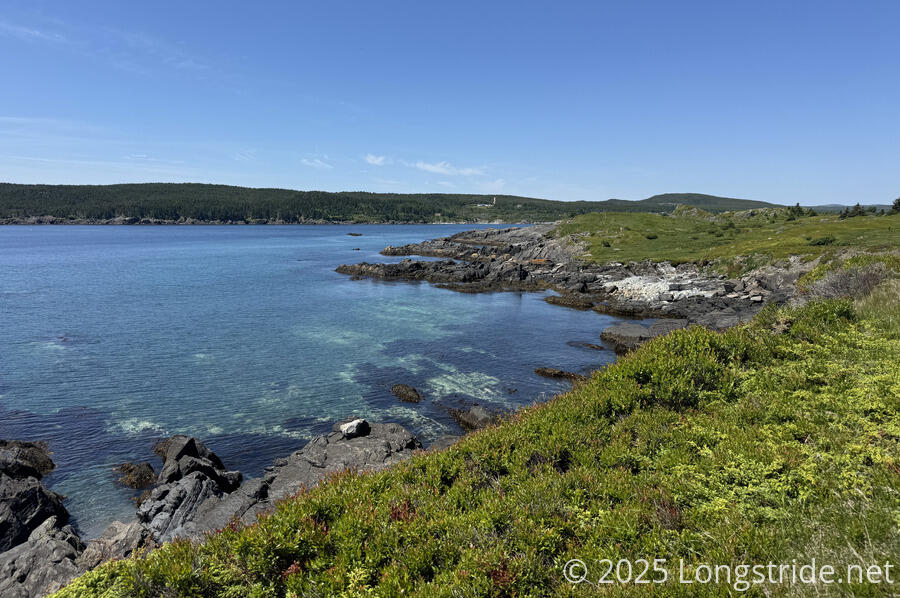 The rest of the walk to the end of the Bear Cove Point Path was relatively uneventful. After a little more rugged and damp trail, it left the forest, going through open hilltops above Renews Harbour. The coast was dotted with coves and rocky outcrops that would be a hazard to navigation. As we turned into the harbor, we passed several small coves with very clear water, attached to rocky beaches, that looked like they would be great for swimming. CareFree wanted to go down to one of the earlier ones we saw, and I was somewhat dubious about that since it looked like a pretty steep walk/climb down. The next couple were essentially completely unreachable from the trail, down a very steep cliff. Another one we passed had a rope someone had installed to make access easier.
