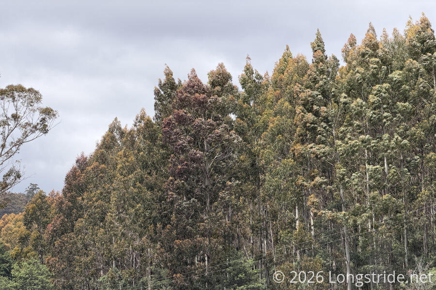 Over the last couple of days, but especially today, we’ve noticed that the eucalyptus trees don’t have their leaves in a (mostly) uniform green. Some of them have leaves that take on red or yellow shades. This was surprising to us, since we didn’t notice this on either the Great South West Walk or Great Ocean Walk, and because eucalyptus trees are evergreen.